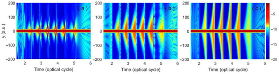 To find out the underlying mechanism of the variation in quantum trajectories contributing to the harmonic emission induced by the SS fields, we analyze the time evolution of the electron wavepacket driven by the SS fields and the SH field. The distribution of the laser field along the polarization direction is the same for the three laser pulses as shown in Figure 1, thus the electron wavepacket dynamics along the polarization direction are the same, which results in the same cutoff of the spectra shown in Figure 2. Hence, the time-dependent transverse distribution of the electron wavepacket at is analyzed. The results are shown in Figure 4a–c for the SS field 1, the SH field, and the SS field 2, respectively. The same color bar is used and represents the square modulus of the electron wavefunction in logarithmic scale. As shown in Figure 4a,b, the electron wavepacket is spread from −100 a.u. to 100 a.u. in the case of the SH field but is spread in the range of −50 a.u. to 50 a.u. in the case of the SS field 1. Comparing the structure of the SS field 1 and the SH field, one can find that the valley structure of the SS field 1 acts as a trap of the electron wavepacket and prevents the electron wavepacket spreading. Hence, the electron wavepacket is confined around the parent ion in the range of −50 a.u. to 50 a.u. As a result, more quantum trajectories contribute to the harmonic emission in the case of the SS field 1. Correspondingly, the harmonic intensity is significantly enhanced compared with that driven by the SH field. In the case of the SS field 2 shown in Figure 4c, the electron wavepacket is widely spread from −200 a.u. to 200 a.u. This is because the peak structure of the SS field 2 accelerates the quantum diffusion of electron wavepacket, leading to a wide spread of the electron wavepacket in transverse direction. Hence, much less quantum trajectories contribute to the harmonic emission, and the corresponding harmonic intensity is suppressed, compared with the case of the SH field. It is demonstrated that the electron wavepacket spreads as , where is the time the electron wavepacket spends in continuum state [15]. Hence, the long quantum trajectory with a large presents more serious quantum diffusion than the short quantum trajectory. As a result, the contributions of the long quantum trajectory to the harmonic emission are more sensitive to the structure of the SS field. Hence the contribution of the long quantum trajectory decreases significantly from SS field 1 to the SS field 2 where the long quantum trajectory disappears.