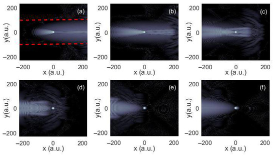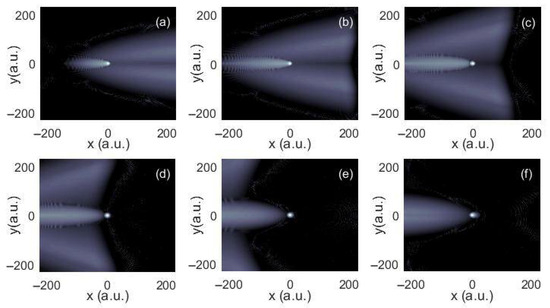 The 2D electron wavefunction at time (panel a), (panel b), (panel c), (panel d), (panel e), and (panel f) The interval corresponds to the second dominating emission peak indicated by the dashed red lines in Figure 3b for the SH field.