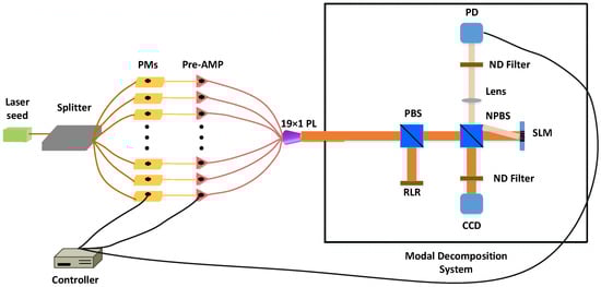 29]. On this basis, we will expand the control channels to 19 and introduce a high-speed mode decomposition system into the control system. In the previous work, we used PMs which are lithium niobate phase modulators with a 10 GHz bandwidth and control accuracy of 0.1 mrad, and a Pre-AMP with an output of the 10 W level and control accuracy in mW, whose precision has far exceeded the required control accuracy of