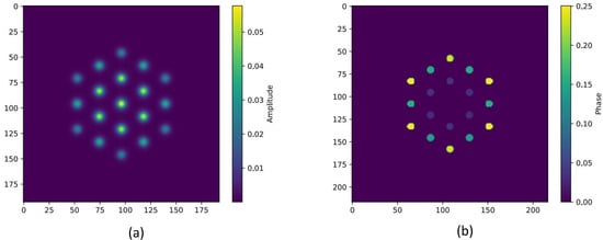 Figure 5. The amplitude decreases from the center outward, following a Gaussian-like distribution of the fundamental mode. The amplitude and phase differences among the single-mode fiber bundles in the second layer are relatively minor, while those in the third layer are more significant, which can be observed from the transmission matrix in the