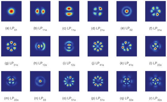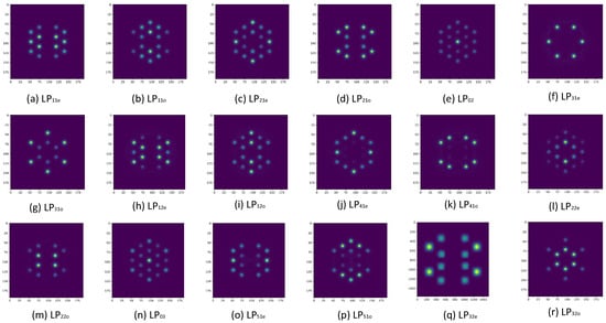 Figure 6. One can observe that the light intensity at the single-mode input end shares some similarities with the distribution of the corresponding high-order mode fields. However, there are also notable differences in the distribution patterns. Furthermore, when comparing the same o and e degenerate states, the input end lacks 90° symmetry. This is due to the fact that the o and e degenerate states have