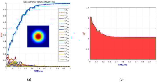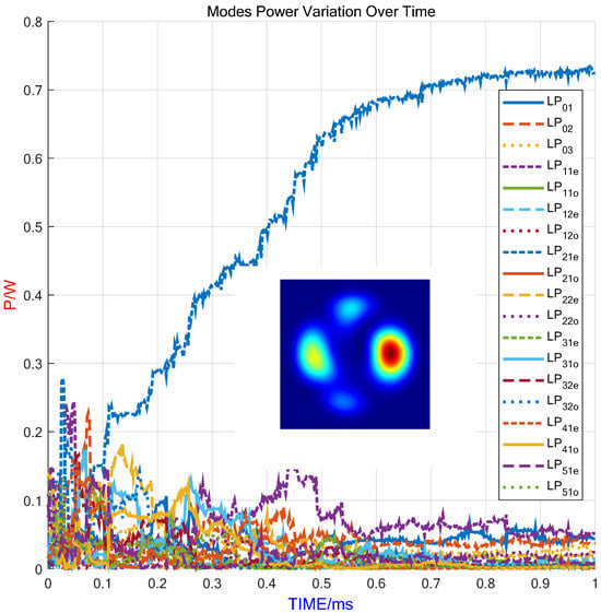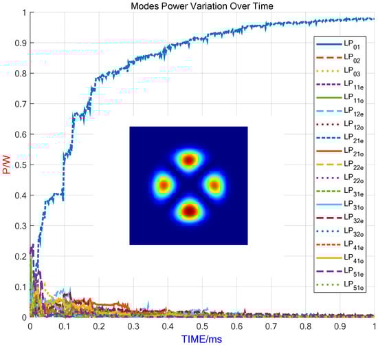 The fundamental mode of fiber lasers, owing to its superior beam quality and high energy concentration, has found widespread application in various fields, such as the industrial and medical sectors. Therefore, we first applied this control system to achieve stable, high-purity fundamental mode control through simulation.