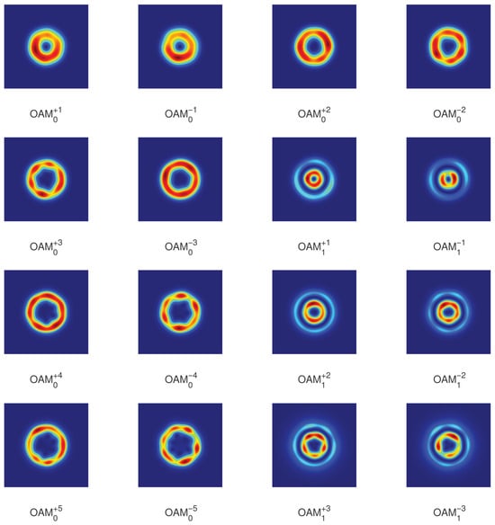 Figure 8 shows the 16 OAM modes that can be generated by the photonic lantern. The orientation of the arrows signifies the rotational direction of the beam (clockwise or counterclockwise), whereas the number of arrows represents the absolute value of the topological charge