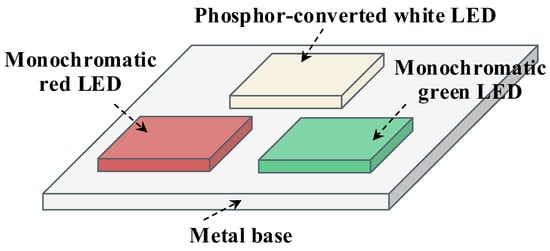 It is noted that the compensated white LED system studied in this paper is composed of a PC white LED, a monochromatic red LED, and a monochromatic green LED—all of which support independent driving. A structural schematic of this system is provided in Figure 1. In this system, the PC white LED serves as the core component and operates in a steady state, thereby providing the basic luminous flux required for lighting applications. Meanwhile, the monochromatic red and green LEDs function as spectral compensators, enabling adjustment of red and green spectral components by regulating the electrical driving state.