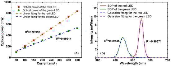 Typically, the SPD of a monochromatic LED can be described using a Gaussian function []. As shown in Figure 2b, the SPDs of the monochromatic red and green LEDs, along with their corresponding Gaussian fitting curves, are presented. The high values of coefficient of determination (R2) indicate the rationality of the Gaussian fittings. Thus, the SPDs of the monochromatic red and green LEDs can be expressed in the mathematical form as follows: