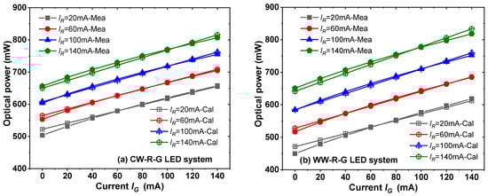Calculated and measured optical power: (a) CW-R-G LED system; (b) WW-R-G LED system.