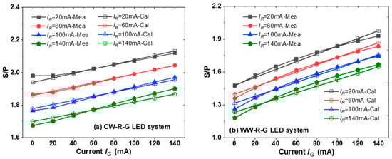 Calculated and measured S/P: (a) CW-R-G LED system; (b) WW-R-G LED system.