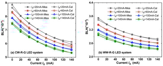 Calculated and measured BLH: (a) CW-R-G LED system; (b) WW-R-G LED system.