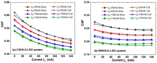 Based on Equation (18), the CAF of the white LED system with compensation of red and green spectra can also be obtained from the driving conditions of the monochromatic red and green LEDs.