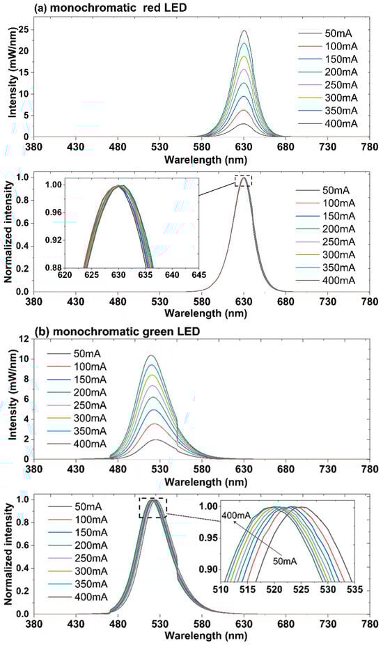 The actual and normalized emission spectra of the monochromatic LEDs versus driving current: (a) the monochromatic red LED; (b) the monochromatic green LED.