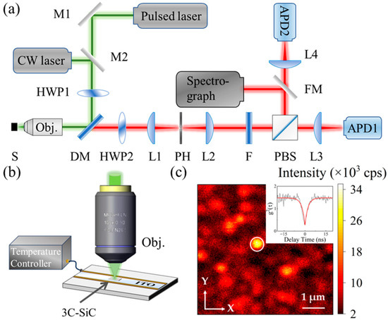 A homemade confocal scanning microscope system integrated with a temperature-controlling device was used to measure the fluorescence characteristics of the defects at various temperatures. As depicted in Figure 1b, a piece of bulk 3C-SiC crystal sample was mounted on an Indium–Tin–Oxide (ITO) conductive glass plate. The temperature controller was designed to heat the electrodes located on either side of the ITO glass. Simultaneously, it provided real-time temperature feedback through a thermistor. This setup enabled temperature control from 293 K (room temperature, RT) to 373 K, with an accuracy of up to 0.1 K. To minimize thermal drift effects during measurements, the system was stabilized for 5 min at each target temperature before the experimental data acquisition. The fluorescence was collected via the same objective lens (×100, N.A. = 0.9, Olympus, Tokyo, Japan), as shown in Figure 1a. The fluorescence signal was split into two paths by a polarizing beam splitter after a long pass filter cutting off at 545 nm and was focused onto two Si-avalanche photo-diode single-photon detectors (APD, SPCM-AQR-14, PerkinElmer, Waltham, America). The two detection modules, combined with a time-correlated single-photon counter (TCSPC), constituted a Hanbury Brown and Twiss (HBT) interferometer, which was used for g2(τ) measurements of the emission. Meanwhile, by inserting a flipping mirror, the fluorescence was directed into a spectrograph (ANDOR, 500i, Belfast, UK) to obtain the fluorescence spectra of individual defects.