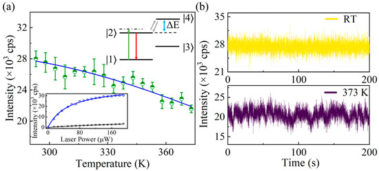 (a) Temperature-dependent fluorescence intensity of the SPE under pulsed laser excitation. The error bars show the standard deviation obtained from multiple measurements. Blue line is the fitting result using Equation (1). The upper-right inset of (a) shows the four-level model adopted to explain the photophysics of the SPE at high temperatures. The bottom-left inset shows the pulsed-laser-power dependence of the fluorescence intensity at RT (blue dots) and the fitting curve (red line). Black squares are the background noise acquired by focusing the laser at the 3C-SiC sample without emitters and fitting curve (black line); (b) fluorescence stability of the SPE at RT (blue curve) and at 373 K (orange curve) under pulsed laser excitation.