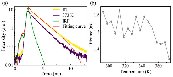 The fluorescence lifetimes, which were measured at RT and 373 K under pulsed laser excitation, are presented in Figure 3a. The results indicated discrepancies in the intensity index between the lifetime curves at the two temperatures. We also recorded the TCSPC photon counting histogram of the green pulsed laser, using the laser pulse synchronization signal as the trigger and the APD output as the stop signal. As shown by the green curve in Figure 3a, we obtained the FWHM of the curve at 477 ± 6.3 ps as the instrument response function (IRF), including the factors from the laser pulse duration, the trigger signal rising edge, the timing jitter of the APD, and the temporal resolution of the TCSPC. The red fitting curve presents the true lifetime curve obtained by convolving the measured data of the SPE’s fluorescence lifetime at room temperature with the instrument IRF. We convolved the curve at every temperature with the IRF to derive the fluorescence lifetime as a function of temperature (gray dots) in Figure 3b and its error bars. When the temperature is below 350 K, the fluorescence lifetime remains stable at around 1.5 ns. As the temperature further increases, the fluorescence lifetime shows a tendency to shorten that is consistent with previous research results [36]. This also further confirms an increase in the proportion of non-radiative channels [33].