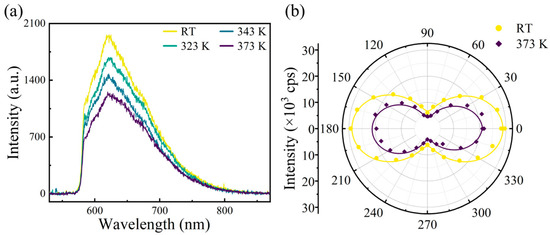 (a) Fluorescence spectra of SPE at four different temperatures: RT, 323 K, 353 K, and 373 K; (b) fluorescence intensity as a function of the polarization angles at RT (yellow spots) and 373 K (purple spots). Solid lines were the fitting result using a sine function.