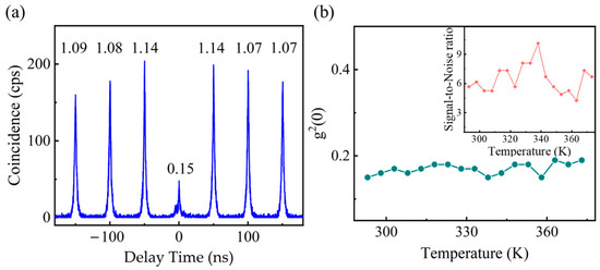 (a) g2(τ) function of the SPE at RT under pulsed laser excitation; (b) temperature-dependent measured g2(0) of the SPE. The inset at the top-right corner shows the signal-to-noise ratio at different temperatures.