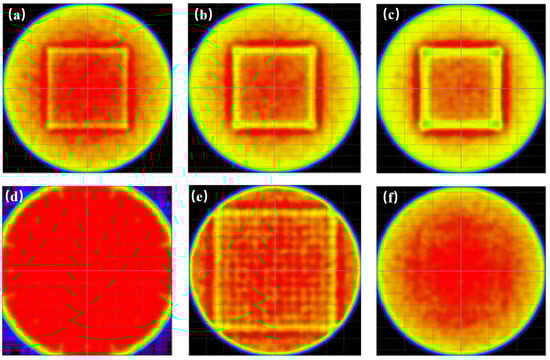 Illumination effects corresponding to the distances between different lenses and the receiving surface: (a) d = 100 mm; (b) d = 200 mm; (c) d = 300 mm; (d) d = 400 mm; (e) d = 500 mm; (f) d = 600 mm.