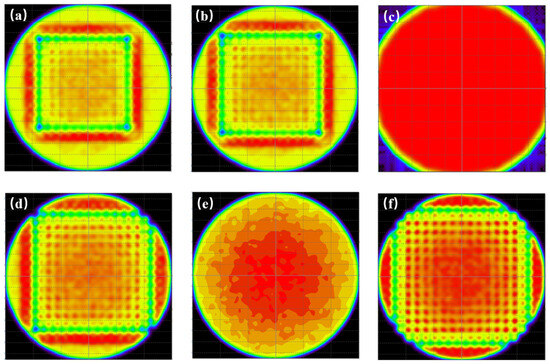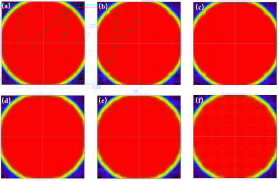 Illumination effect corresponding to the change in the number of lens arrays: (a) 11 × 11 array; (b) 12 × 12 array; (c) 13 × 13 array; (d) 14 × 14 array; (e) 15 × 15 array; (f) 16 × 16 array.