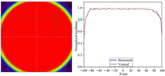 As can be seen from Figure 5, the ray tracing simulation is carried out by using the same LED chip and adjusting the same number of rays. By setting the radius of the lens in the microlens array to 2 mm and the distance between the microlens array and the receiving plane to 300 mm, and by setting the number of microlens arrays to 11 × 11, 12 × 12, 13 × 13, 14 × 14, 15 × 15, and 16 × 16, it can be seen from the simulation results obtained in Figure 5 that different numbers of microlens arrays can achieve different uniform illumination results. When the number of microlens arrays selected is 13 × 13, its uniform illumination effect is better. When the number of arrays is larger or smaller, there is still room for improvement in its uniform illumination effect. Seek the optimal uniform illumination solution among the number of 13 × 13 microlens arrays.