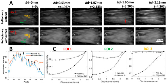 In addition to the improved sensitivity to the tissue realignment with SLI, the reflectance images with SLI showed an enhanced contrast of the superficial layer of the tissue, which is likely due to the effective suppression of diffuse photons. Figure 3B shows the normalized intensity plots along a line ROI (red line). It is evident that the intensity profile with SLI exhibits a much wider range of intensity than that without SLI. Additionally, more intensity peaks are visible with SLI, as highlighted with black arrows. The improved contrast could facilitate the identification of certain tissue features and/or enable marker-free tracking of tissue deformation.