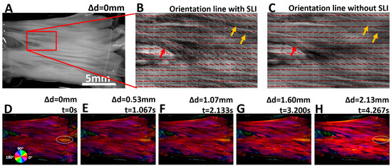 (A) Image of the heart valve leaflet at the initial stretching state, with red box indicating the region used for orientation overlay. (B,C) show fiber orientation lines (with and without SLI) overlaid on grayscale tissue images. Orientation lines obtained with SLI show improved accuracy and better alignment with the apparent surface features of the tissue, as indicated with red and yellow arrows. (D–H) show the color-coded fiber orientation maps weighted by the corresponding tissue reflectance images. Orientation color changes are highlighted within the dashed-white oval ROI at the beginning and end of stretch.
