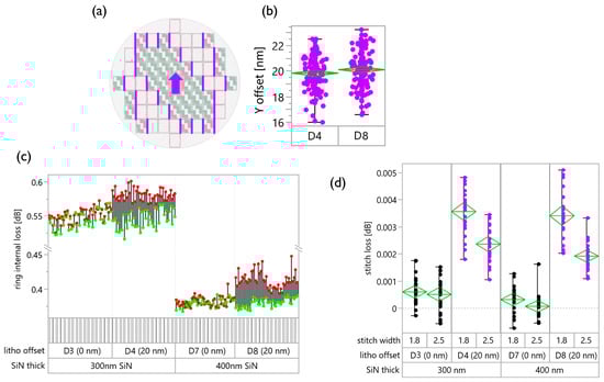 To validate the 0.001~0.002 dB stitch loss in Figure 7, a 20 nm y-direction reticle offset was imposed on D4 and D8 wafers by slightly offsetting the whole mask B lithography job. This was designed to see an expectedly higher waveguide stitch loss at the specific locations (the purple interfaces in Figure 8a). The overlay (OVL) inspection revealed that the reticle y-offset at the purple interfaces was increased to 20 ± 4 nm (mean ± 3σ). Then, the internal loss of the stitch ring and ref ring in wafers D4 and D8 was measured. For comparison, wafers D3 and D7 (without the 20 nm imposed y-offset) were also measured. Each wafer had more than 10 random dies measured at the purple interfaces. The results of the ring internal loss of the add–drop ring resonator pairs are presented in Figure 8c. The red markers are the internal loss of the stitch rings, the green markers are the internal loss of the ref rings, and the black bars are the internal loss difference between the stitch ring and ref ring. Obviously, wafers D4 and D8 showed higher stitch ring internal loss compared to wafers D3 and D7. Then, the increased SiN waveguide stitch loss can be calculated in Figure 8d; stitch loss increases to 0.002~0.005 dB due to the worse 20 nm y-offset. Notably, the 2.5 µm wide taper-up stitch exhibits ~0.001 dB lower loss compared to the 1.8 µm wide taper-up stitch. This indicates that a wider stitch width is better when the reticle offsets worsen.