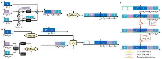 Figure 1a displays the operational principle of electrical band multiplexing based on digital-band-interleaving (DBI) technique. The target DBI waveform is composed of three mutually independent sub-bands, whose bandwidths are denoted , , and , respectively. Band 1 is retained at baseband. Band 2 is up-converted by a RF LO operating at frequency , producing an upper sideband (USB) located in the interval [, ] together with an undesired lower sideband (LSB) image. Both the image and the residual LO are suppressed by a sharp high-pass filter (HPF) after the mixer. Similarly, sub-band 3 is translated to an intermediate frequency by another RF LO set at , and a subsequent HPF selects the desired LSB spanning [, ], while rejecting the residual LO and the complementary LSB. The three conditioned sub-bands are finally combined by a mixer, and the aggregate electrical drive is applied to a wideband Mach–Zehnder modulator (MZM) to yield an intensity-modulated optical signal whose base-band spectrum extends over . Nevertheless, such electrical multiplexing schemes approach considerable hardware complexity, particularly in the design and monolithic integration of high frequency RF mixers and oscillators.