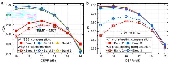 Figure 2b displays the influence of CSPR of band 1 on NGMI performance of bands 2 and 3. In the absence of cross-beating interference compensation, both medium- and high-frequency sub-bands (i.e., band 2 and 3) exhibit the same trend with increasing CSPR that is observed for band 1, and band 3 consistently outperforms band 2 across the entire 16–26 dB CSPR range, indicating that band 2 is more susceptible to nonlinear SSBI distortion. Enabling the digital compensation algorithm to raise the NGMI of both bands, removing the performance gap and yielding essentially identical results, thereby validating the effectiveness of the proposed interference-cancelation scheme.