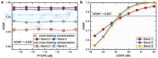 We first quantified the influence of carrier-to-signal power ratio (CSPR) of the intensity modulated signal (band 1) on system performance in Figure 2a. For all three bands, the NGMI first improves and then degrades as CSPR increases. A lower CSPR introduces strong nonlinear distortion, whereas a high CSPR reduce the effective SNR. Consequently, a CSPR of 20 dB is selected as optimum, maximizing the NGMI of band 1 while maintaining excellent performance for band 2 and 3. The benefit of SSBI-mitigation algorithm described in Section 2 is evident from the comparison between compensated and uncompensated curves in Figure 2a. At low CSPRs, the algorithm yields a larger gain for band 1, where nonlinearity is more pronounced. The improvement to other bands is relatively limited, and virtually negligible for band 3, which is consistent with its low level of cross-beating interference.