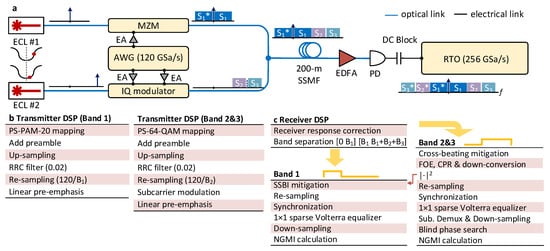 At the transmitter, as shown in Figure 4b,c, the DSP sequence begins by mapping the payload bits allocated to band 1 onto a PS-PAM-20 constellation. We chose this modulation format to exploit the relatively higher SNR at a low-frequency region and therefore maximized the overall bitrate. Next, a 2048-symbol preamble was added for receiver-side frame synchronization and channel equalization. Both symbol sequences were then up-sampled and shaped with a root-raised-cosine (RRC) filter having a roll-off of 0.02. For band 1, the waveform was re-sampled to match the sampling rate of AWG and passed through a linear pre-emphasis FIR filter to pre-compensate for the transmitter-side bandwidth limitation. For bands 2 and 3, the bits assigned to bands 2 and 3 was mapped onto a PS-64-QAM constellation. The frame included a 4096-symbol preamble. After the RRC shaping and re-sampling, the signals were subcarrier-multiplexed to form a double-sideband spectrum, followed by a linear pre-emphasis stage. A 1.6-GHz guard band was inserted at the baseband to prevent corruption of the residual-carrier component by the signal spectrum.