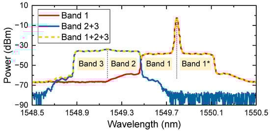 Figure 5 presents the measured optical spectrum of the transmitted triple-band signal, recorded with a resolution of 0.01 nm. Band 1 is centered at approximately 1549.79 nm, while bands 2 and 3 are jointly located at 1549.17 nm. To combat the S21 response of the receiver, the power spectral density of bands 2 and 3 was intentionally enhanced compared to band 1. The two main strategies were to align the power spectral density of each band either in the optical or received electrical spectrum. In this experiment, we grouped the power levels of band 2 and 3 to make a partial pre-emphasis as a trade-off between complexity and performance. The inter-band crosstalk was maintained below −30 dB across the entire spectral range, indicating effective optical band multiplexing and minimal inter-band interference.