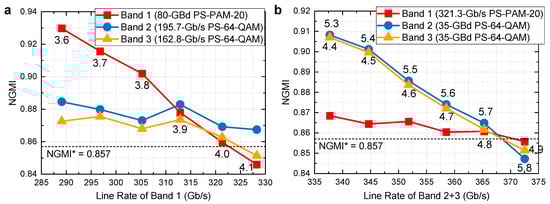 We first maximized the data rate of band l by sweeping its source entropy. Figure 6a presents the measured NGMI of band 1 as its line rate is increased while the line rates of band 2 and 3 are held constant at 195.7 Gb/s and 162.8 Gb/s, respectively. A monotonic decline in NGMI was observed with increasing throughput of band 1. At the NGMI threshold of 0.857, the maximum achievable source entropy was 4.0 bits/symbol. The corresponding line rate was 321.3 Gb/s. Considering the code rate of 0.826 [30], this yields a net bit rate of 251.7 Gb/s for band 1. Throughout the sweep, the NGMI values of bands 2 and 3 remained initially stable and then decreased slightly, attributed to residual imperfections in the cross-beating interference compensation.