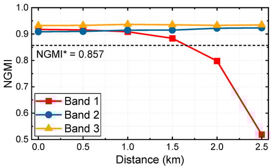 As shown in Figure 9, the NGMI performance of bands 2 and 3 remains nearly unaffected as the transmission distance increases. This behavior can be attributed to the fact that these two bands are generated as complex-valued single-sideband signals and therefore do not possess conjugate sidebands, rendering them inherently resistant to dispersion-induced power fading. In contrast, band 1 is generated via intensity modulation, and its NGMI performance degrades significantly when the fiber length exceeds approximately 1.5 km.