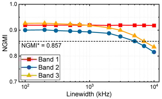 As shown in Figure 10, the NGMI performance of band 1 remains unchanged over a wide range of laser linewidths. This behavior arises because band 1 follows a conventional IM-DD configuration, in which the optical phase noise is completely removed after the square-law detection of the photodiode.