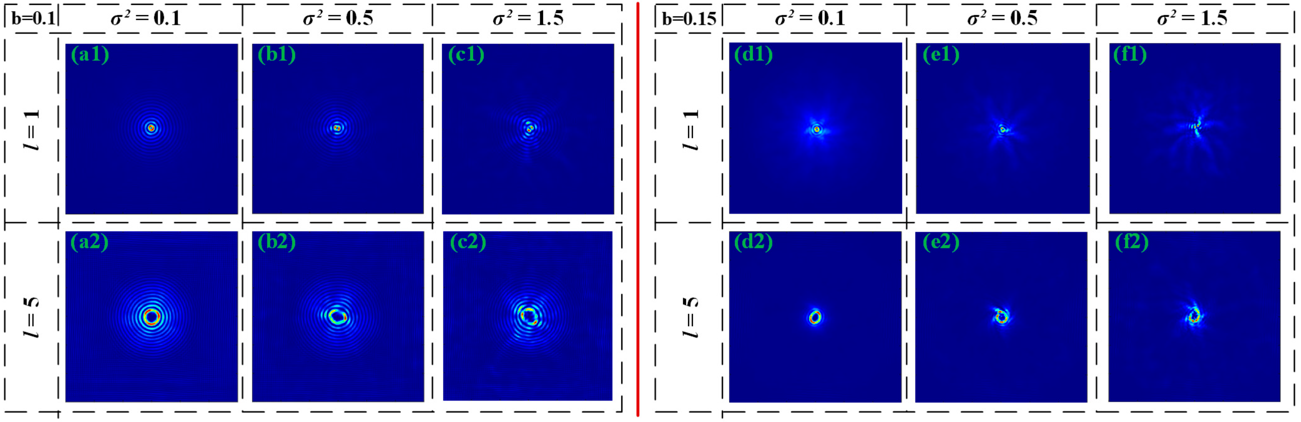 σ2 = 0.5 induces asymmetric distortion in the main beam, with slight displacement of the central dark core. Particularly for the higher-order vortex, due to its more complex phase structure, its outer ring experiences greater perturbation. As shown in