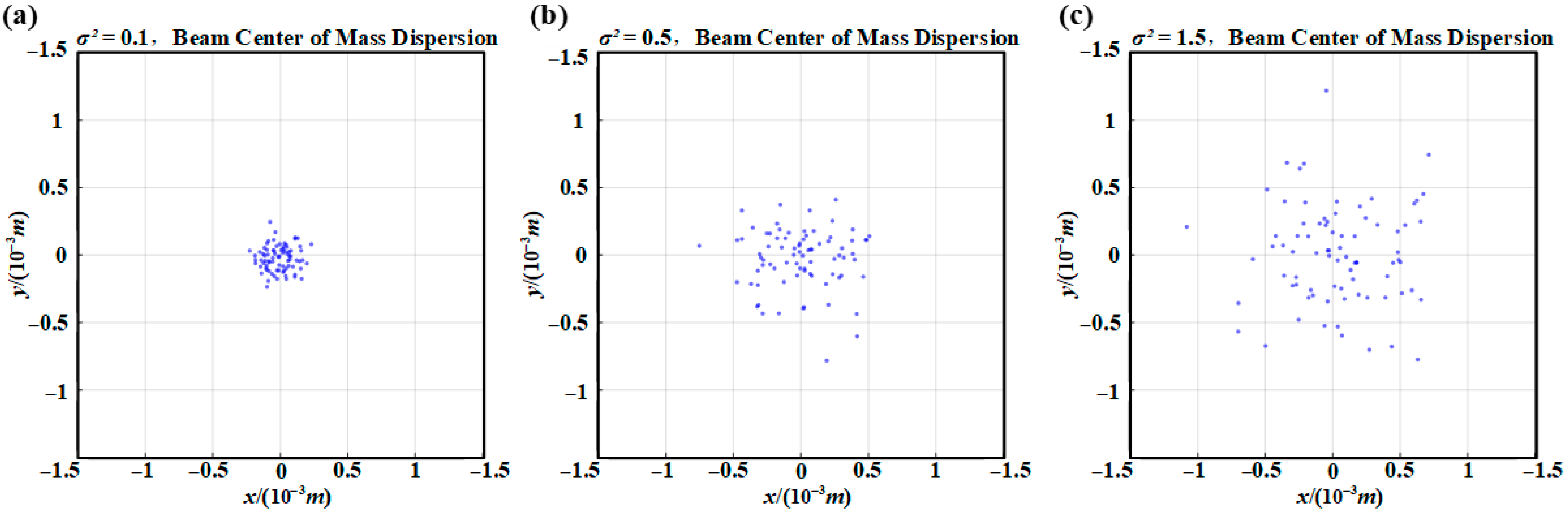 Figure 4a–c, the higher the turbulence intensity, the more pronounced the cumulative effect of random refraction during the propagation of the beam, leading to a continuous increase in the center-of-mass jitter of the RAiGV beam on the receiving plane. Under conditions of