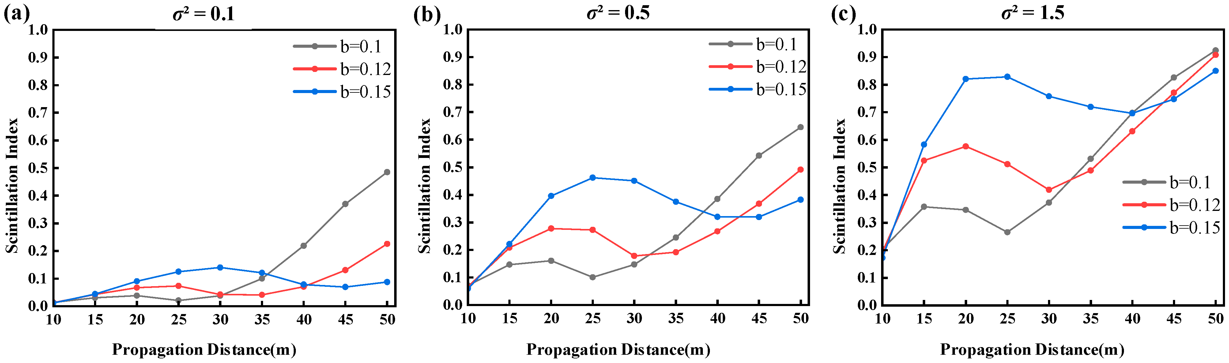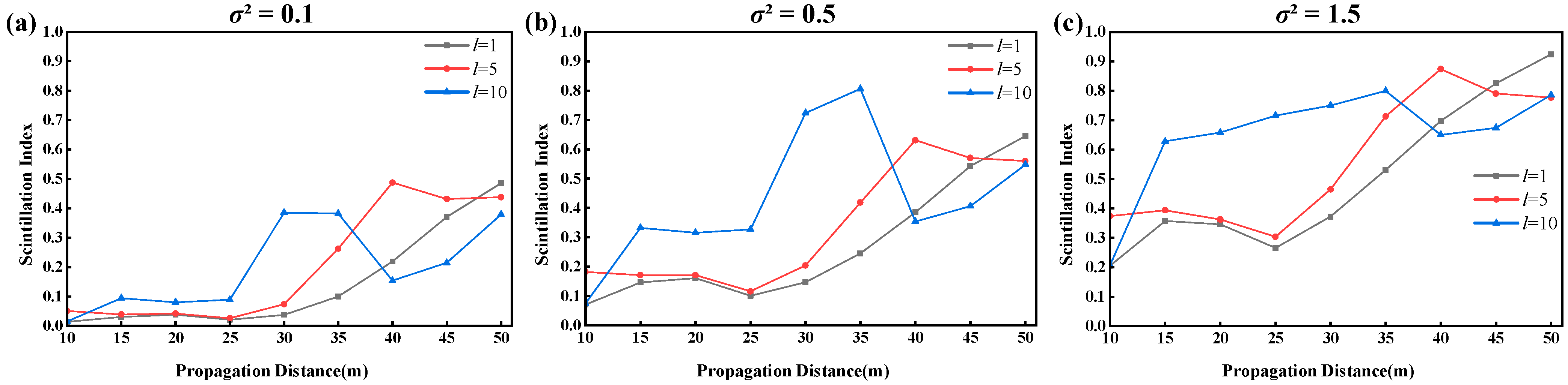 In turbulent environments, the SI of the RAiGV beam with a topological charge l = 1 exhibits a non-monotonic “rise-fall-rise” trend with increasing propagation distance, which is associated with its self-accelerating focusing characteristics. Due to the forward self-focusing behavior of the Airy structure, the energy of the main ring of the beam concentrates sharply near the focal point, reducing normalized intensity fluctuations and leading to a local minimum in SI within this region. Numerical simulations indicate that when the distribution factor is b = 0.1, the beam achieves strong focusing at approximately ; whereas at b = 0.15, the focal position shifts towards the far field to approximately . At the focal point, the sharply enhanced main-ring intensity suppresses normalized intensity fluctuations, reducing SI and forming a typical “valley.”