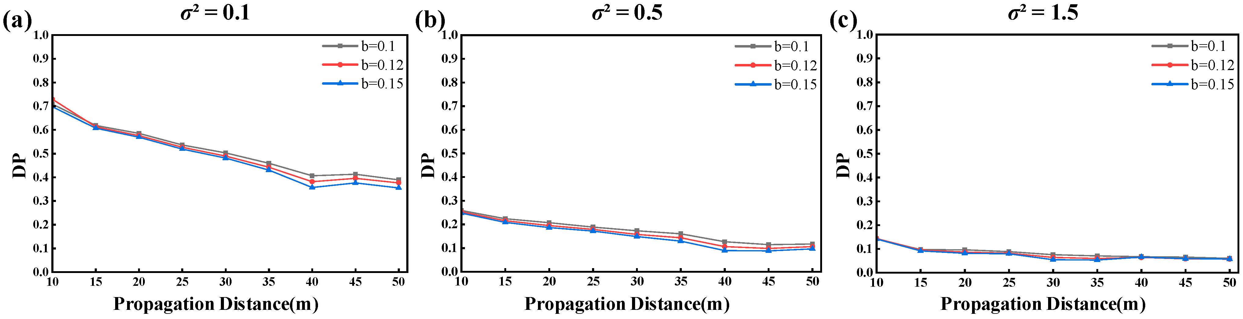 b = 0.1, 0.12, and 0.15. DP reflects the degree of mode integrity preserved when the beam reaches the receiving plane, serving as a crucial metric for evaluating communication link reliability. As the propagation distance increases from 10 m to 50 m, all curves exhibit a pronounced downward trend, indicating that the beam accumulates wavefront distortion and speckle interference caused by OT during long-distance transmission, leading to an increase in SI.