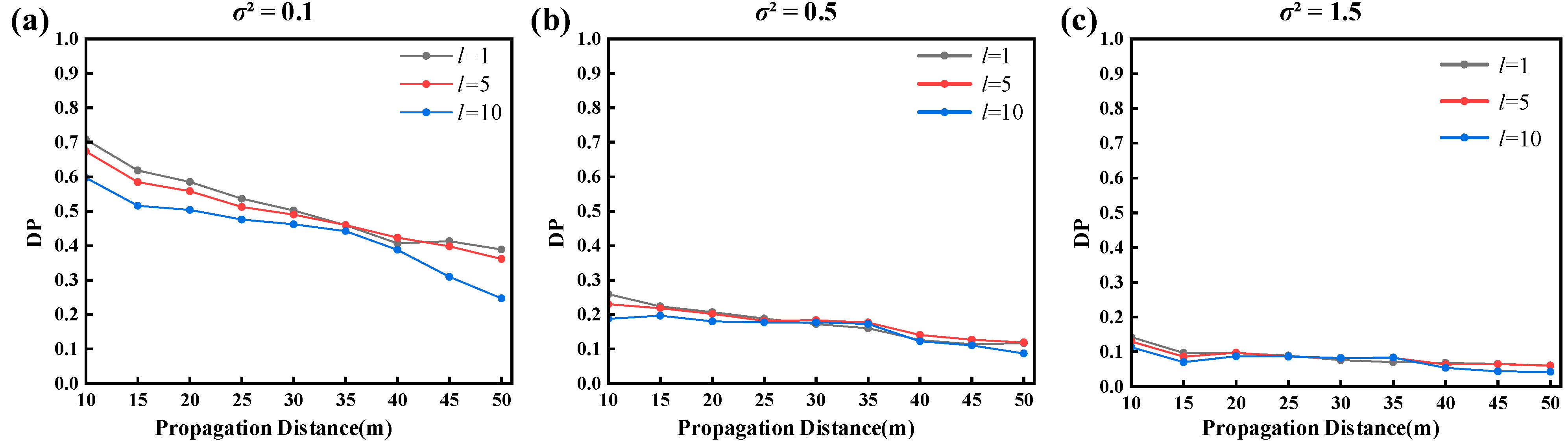 Figure 8b,c demonstrate that as turbulence intensifies, it is the strength of the turbulence, rather than the topological charge, that predominantly influences the DP of RAiGV beams.