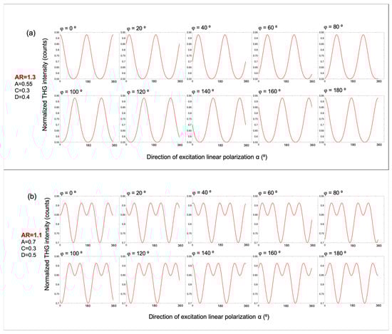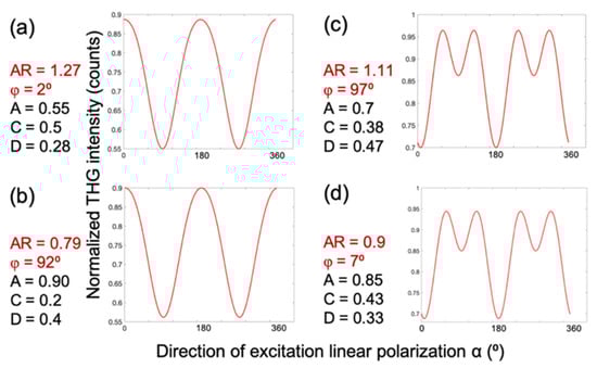 To generate a P-THG modulation curve, the free parameters in Equation (6) are set to the following values: AR = 1.27, φ = 2°, A = 0.5, C = 0.5, and D = 0.28, as shown in Figure 4a. Interestingly, a similar modulation profile can be obtained with a different parameter set: AR = 0.79, φ = 92°, A = 0.9, C = 0.2, and D = 0.4 (Figure 4b). Likewise, a different modulation pattern is reproduced in Figure 4c using parameters AR = 1.1, φ = 97°, A = 0.7, C = 0.38, and D = 0.47, which closely resembles the result in Figure 4d, where the values are AR = 0.9, φ = 7°, A = 0.85, C = 0.43, and D = 0.33. These comparisons reveal that the modulation curves remain nearly invariant when φ is shifted by 90° and the anisotropy ratio is simultaneously inverted (i.e., AR→1/AR). This degeneracy suggests that when fitting the experimental data, the iteration algorithm might converge to two different sets of values for the free parameters in Equation (6), that nevertheless describe the same data. To resolve this ambiguity during data fitting, and to obtain comparable values for the free parameters, the criterion AR > 1 is imposed to the fitting algorithm.