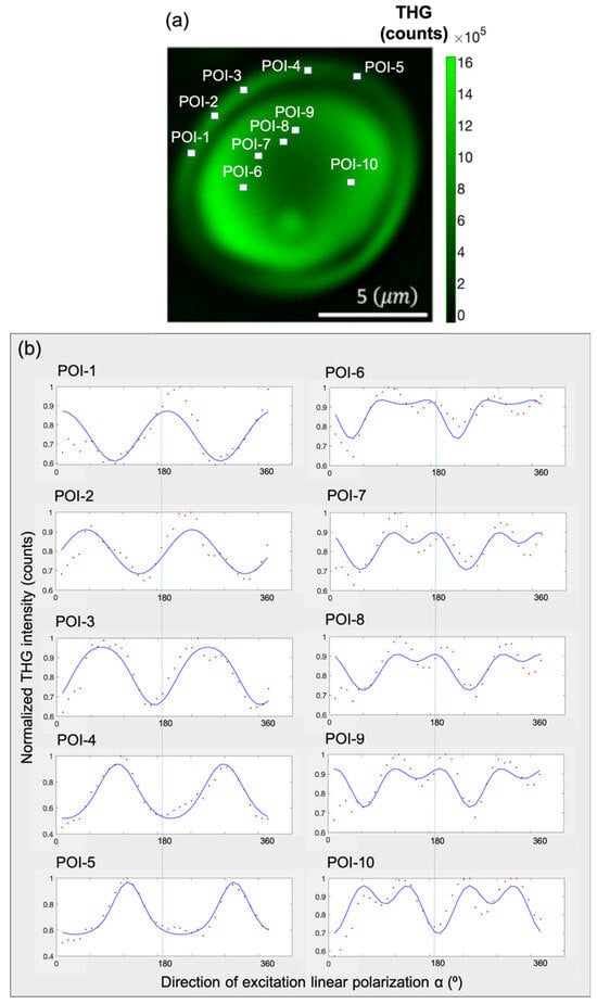 Experimental P-THG from selected points-of-interest (POIs) and fitting with the model. (a) Composite image formed by summing all the THG images seen in Figure 5b. Five POIs are selected within the shell of the granule and five POIs within its core. (b) P-THG modulation curves for each POI, obtained by fitting the experimental data using Equation (6). The POIs 1–5 (shell), present different AR values from POIs 6–10 (core), highlighting the structural anisotropy between the two regions.