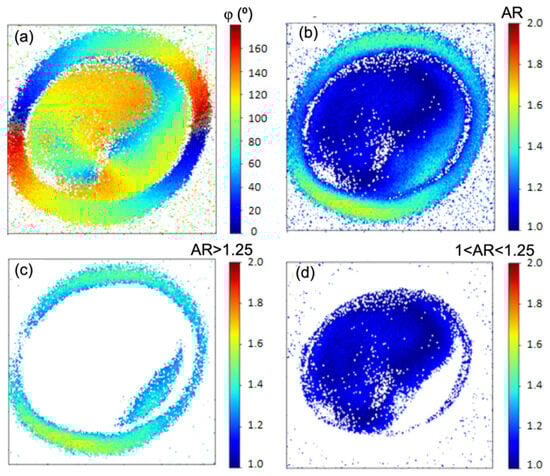 Pixel-by-pixel mapping of the molecular orientation angle and the anisotropy ratio. (a) Pixel-wise map of the molecular orientation angle φ. The evolution of the colors in the granule shows a radial distribution of the molecular structures. (b) Pixel-wise map of the anisotropy ratio AR. (c) Mapping of regions with AR > 1.25, highlighting the shell of the granule. (d) Mapping of regions with 1 < AR < 1.25 exposes the core of the granule.