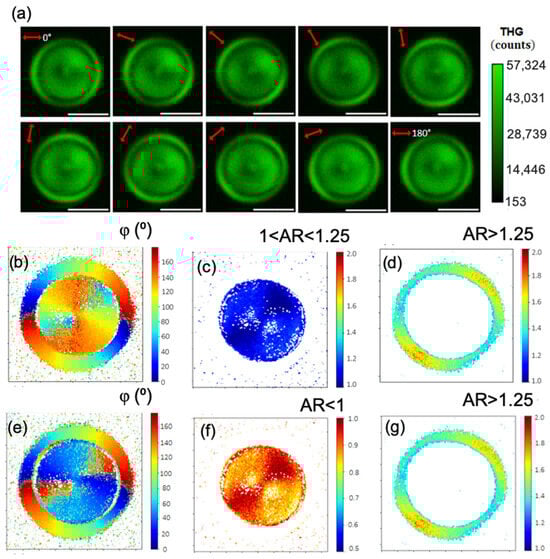 P-THG analysis of another corn starch granule. (a) Series of THG images acquired as the excitation linear polarization (indicated by the red double arrow) is rotated from 0° to 180° in 20° increments. Scale bars: 5 μm. (b) Mapping of the angle , after pixel-wise fitting of the images seen in Video S2 with Equation (6). (c) Pixel-wise map of the AR. Mapping of regions with 1 < AR < 1.25 highlights the core of the granule. (d) Mapping of regions with AR > 1.25 reveals the shell of the granule. (e) Mapping of the angle , where a −90° shift was applied in the core. This choice of solutions “aligned” the evolution of the angles in the shell with the evolution of the angles in the core. (f) Mapping of the AR after the substitution AR = 1/AR in the core of the granule. (g) In the shell, there is no substitution of AR; consequently, it remains that AR > 1.25.