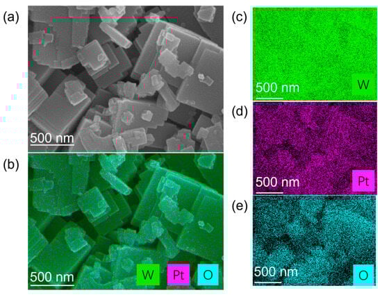 Structural and elemental characterization of Pt-loaded tungsten trioxide (Pt/WO3) nanomaterials. (a) SEM image showing the morphology of WO3 nanosheets decorated with fine Pt nanoparticles. (b) Corresponding EDS elemental mapping overlay of W, Pt, and O. (c–e) Individual elemental mapping images of W (green), Pt (magenta), and O (cyan), respectively.