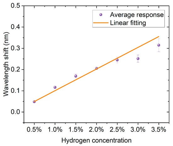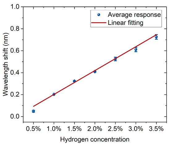 The linear relationship between hydrogen concentration and wavelength shift. Blue dots with error bars represent the average responses, and the red line indicates the linear fitting.