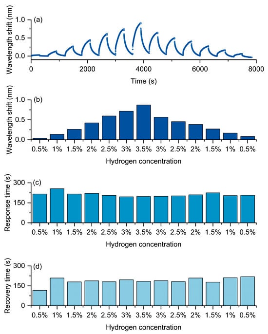 As shown in Figure 7, the experimental results clearly demonstrate the typical concentration dependence and kinetic characteristics of this optical fiber hydrogen sensor under the hydrogen-induced exothermic mechanism. Figure 7a presents the continuous response curves of the optical fiber hydrogen sensor at different hydrogen concentrations. As the hydrogen concentration gradually increases from 0.5% to 3.5%, the redshift amplitude of the resonance wavelength significantly increases and reaches its maximum at the highest concentration. When the hydrogen concentration gradually decreases back to 0.5%, the wavelength response decreases and approaches the initial state, indicating that the sensor not only has good sensitivity but also maintains excellent reversibility and repeatability in concentration cycles. The statistical results shown in Figure 7b further verify the monotonic dependence of the wavelength shift on the hydrogen concentration, demonstrating that the sensor can effectively distinguish different concentration levels and exhibit outstanding quantitative detection capability.