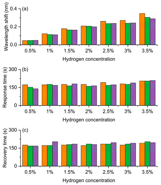 Experimental results of the FBG hydrogen sensor based on exothermic hydrogen-sensitive nanomaterials with a central wavelength of 1541 nm. (a) Wavelength shift as a function of hydrogen concentration. (b) Response time at different hydrogen concentrations. (c) Recovery time corresponding to hydrogen concentration. The orange, green and purple bars represent the first, second, and third measurement cycles, respectively.