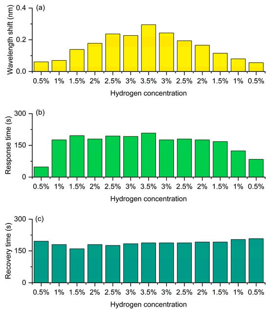 Figure 11 shows the hydrogen detection performance of the FBG hydrogen sensor based on hydrogen-induced exothermic nanomaterials at a central wavelength of 1541 nm. During the experiment, the sensor was exposed to hydrogen gas at different concentrations (0.5–3.5%) for 3 min each, followed by air for 3 min, completing a full cycle before gradually reducing the hydrogen concentration. As shown in Figure 11a, during the hydrogen concentration increase phase, the hydrogen-induced wavelength shift significantly increases with the concentration, reaching the maximum at 3.5%, indicating that the exothermic reaction is stronger at higher concentrations, leading to an increase in grating temperature and refractive index change, thus causing a greater red shift. During the hydrogen concentration decrease phase, the wavelength shift gradually decreases with concentration, demonstrating the sensor’s good reversibility and stability. Figure 11b indicates that the response time increases with the hydrogen concentration and slightly rises at high concentrations (about 3.5%), then gradually decreases during the concentration reduction process, which is related to the diffusion and desorption rates of hydrogen in the sensitive layer. Figure 11c shows that the recovery time remains stable overall and varies little at different concentrations, indicating that the sensor has good dehydrogenation ability and thermal stability in air. Overall, the sensor exhibits high sensitivity, good repeatability and reversibility during the increase and decrease cycles, verifying its feasibility for reliable hydrogen detection over a wide concentration range.