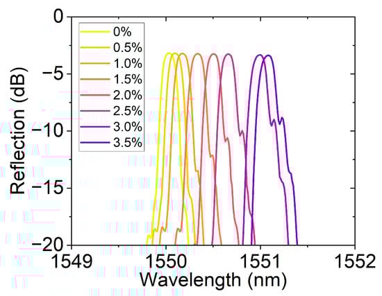 Reflection spectra of the FBG hydrogen sensor at different hydrogen concentrations (0–3.5%).