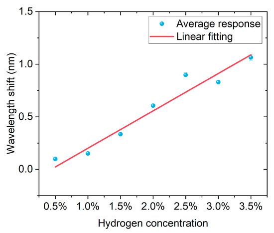 Figure 14 shows the linear relationship between hydrogen concentration and the average wavelength response. By averaging the wavelength shift for each concentration over three experiments, it can be observed that the wavelength increases significantly with the rise in hydrogen concentration, showing a good linear growth trend. The linear fitting results indicate that the fitting equation is y = −0.154 + 0.355x, with a slope of 0.355, which means the sensitivity of the wavelength shift to hydrogen concentration is approximately 0.355 nm/%. The coefficient of determination R2 = 0.932, indicating a high degree of fitness and good consistency of the data. The results demonstrate that this fiber optic hydrogen sensor has a stable and linear spectral response characteristic to hydrogen concentration changes, enabling quantitative analysis of hydrogen concentration.