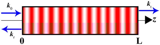 The geometry of the problem. The periodic alternation of red and white areas indicates a harmonic change in the permittivity of the PC along the z axis. , , and are the wave vectors of the incident, reflected, and transmitted waves, respectively. L is PC thickness.